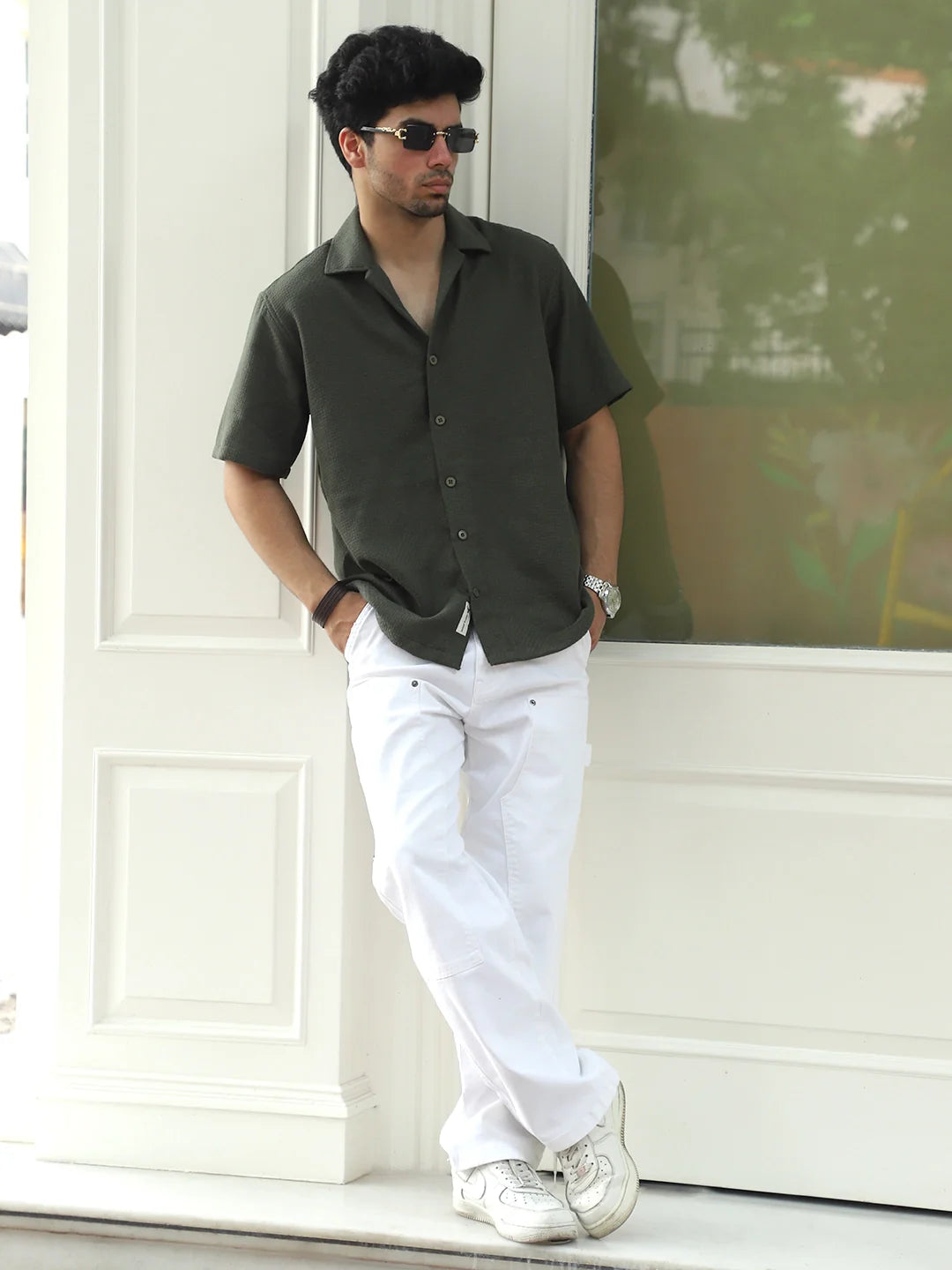 Elevate your wardrobe with our Tactile Textured Olive Green Half Sleeve Shirt. The distinctive textured fabric provides both visual interest and superior comfort, while the versatile beige tone complements various styling options. Precision-tailored for an impeccable fit, this shirt transitions seamlessly between professional settings and casual occasions, making it an essential addition to any discerning gentleman's collection.